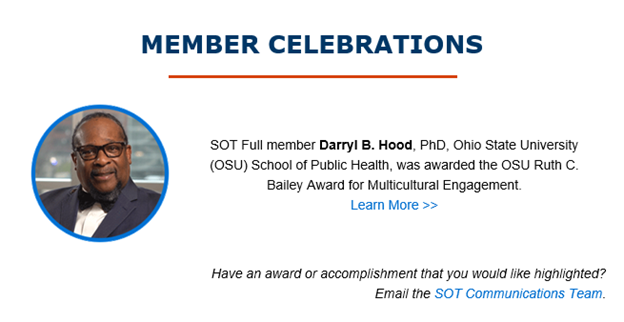 In this new section, SOT features significant accomplishments by its members, such as earning a major non-SOT award or an appointment to a prestigious organization or committee. Further, anything acknowledged in this new email section also will be highlighted on the SOT social media accounts.