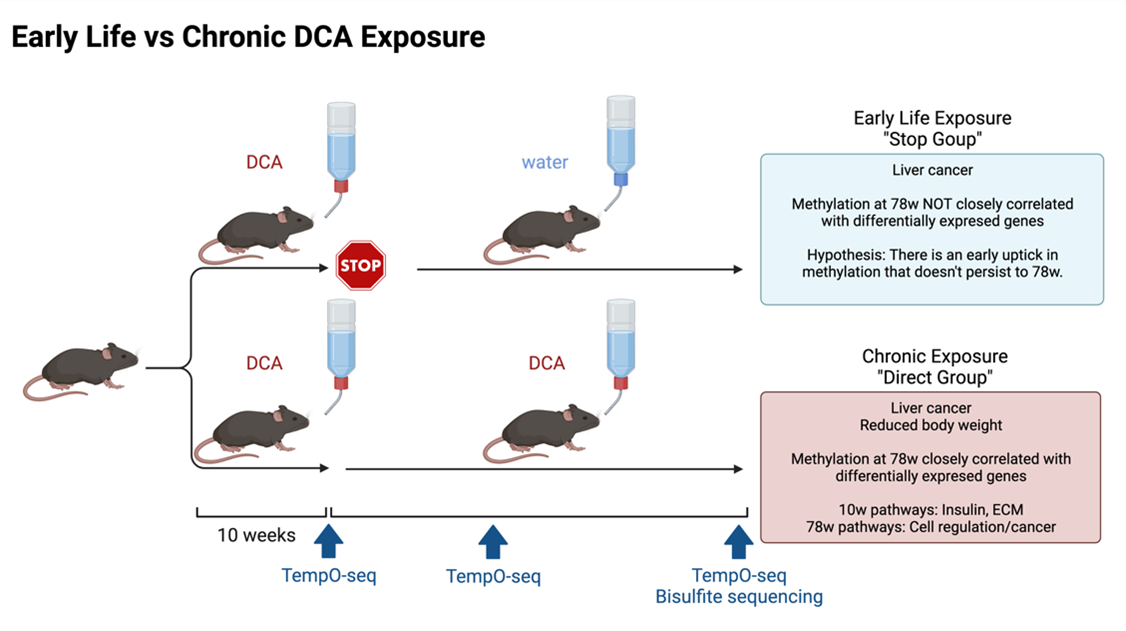 In the historical study, mice had an increased incidence of liver cancer 84 weeks after exposure to dichloroacetic acid (DCA). To determine if the early-life exposure left a persistent epigenetic footprint responsible for the latent carcinogenicity, Dr. Chorley et al. assessed DNA methylation and gene expression at 78 weeks. While both a 10-week exposure to DCA and chronic DCA exposures led to an increase in liver cancer incidence, it turns out that carcinogenesis occurred through two unique mechanisms of action. Ten-week early-life exposures had a completely distinct, different genomic and epigenetic signature, activating fibrosis and biosynthesis gene expression pathways, while continuous exposure activated cancer pathways. Gene expression analysis at 10 weeks showed insulin dysregulation followed by dysregulation of extracellular membrane pathways.
