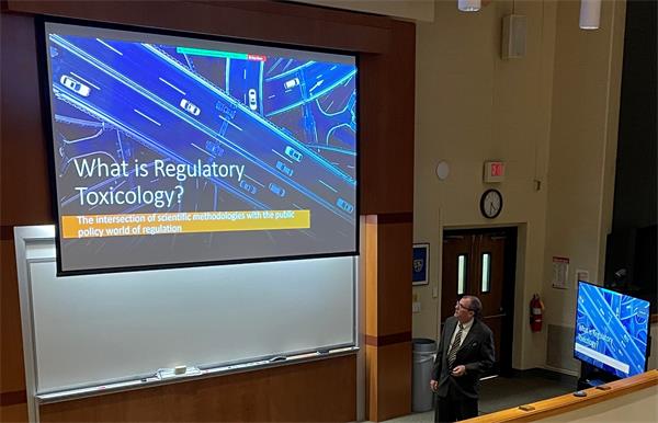 The afternoon ended with our three presentations (total time one hour): Toxicology as a Career Choice (Beierschmitt), Toxicological Risk Assessment of Impurities in Pharmaceutical Products (Beierschmitt), and Regulatory Toxicology and the Science behind Pesticide Registration (McMahon). The first brief presentation was a general overview of what toxicology is, what types of work we do, where we are employed, and how one becomes a toxicologist; the SOT-developed slide set available on its website was extremely helpful in developing this talk! Then, Tim and I discussed certain aspects of our jobs as toxicologists in pharmaceutical development and regulatory toxicology, respectively. The main purpose was to communicate to the students that while we are both trained toxicologists, there are many specialty areas that exist within our field, but in the end, we share the same goal of helping to make the world a safer place. The presentations took place in the main auditorium of the science building, with about 35 students in attendance and several faculty including Dean McCauslin, Dr. Patterson, Dr. Krueger, Dr. Taylor-Burt, and Dr. Kraig Sheetz, Executive Vice President of Mount St. Mary’s and Professor of Physics). The presentations also were broadcast and made available to students and staff via Zoom. What struck me when I began the first talk was that I was presenting in the same room as Dr. Morgenroth when he came to Mount St. Mary’s to talk with us about toxicology all those years ago, only I was the one standing at the front of the class now. In terms of undergraduate outreach as it relates to toxicology, I had come full circle.